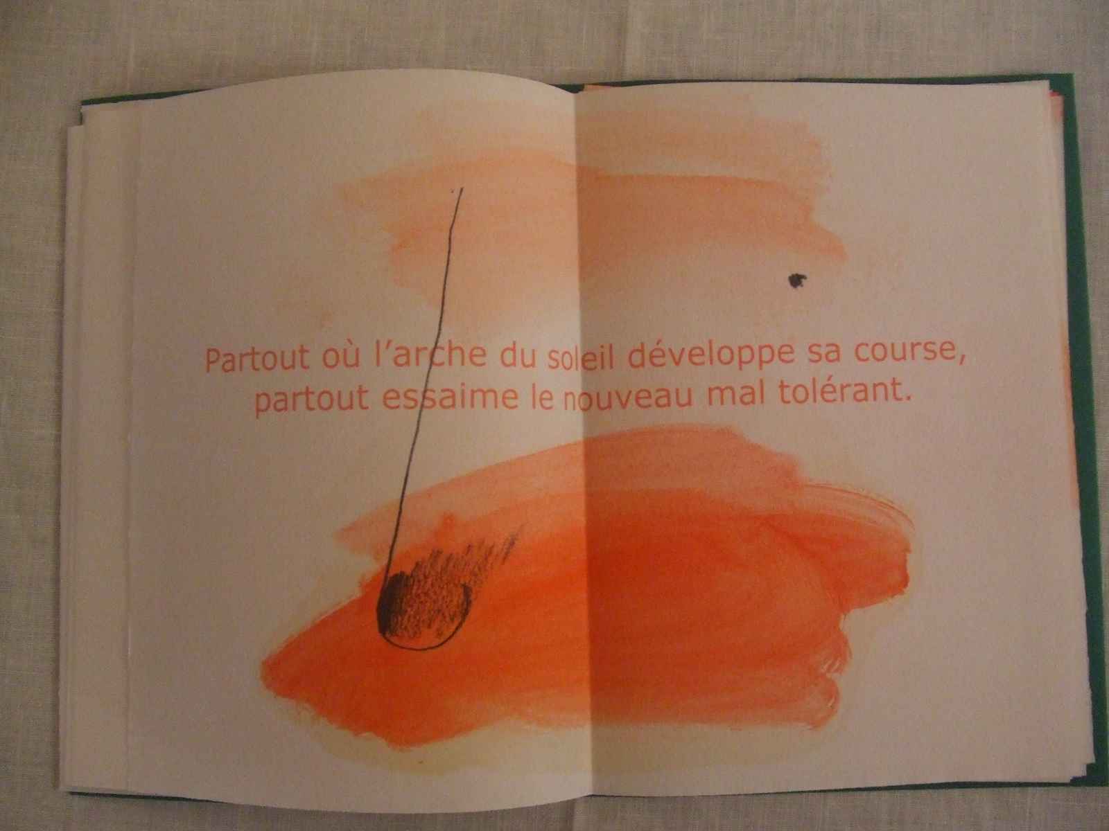 poïein volume 28 (2007) Pulvérin / René Char Neuf pages de papier velin pliées en deux dans une chemise en carton, chaque page comprenant le texte de René Char avec des interventions aux crayons et à la peinture à l'huile (15,5 cm x 22 cm) Huit exemplaires numérotés et signés (100 €) Copyright: Editions Gallimard pour le texte de René Char tiré du recueil Fureur et Mystère.