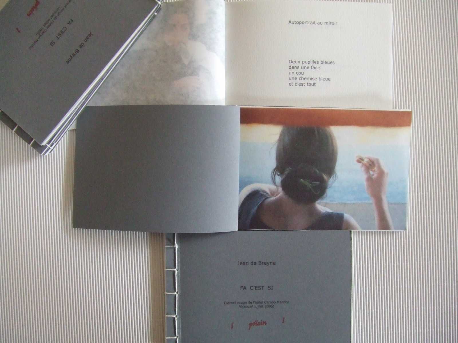 poïein volume 30 (2007) FA C'EST SI (carnet rouge de l'hôtel Campo Marzio/ Vicenza/ juillet 2005) Petit carnet de quinze pages, relié à la chinoise, imprimé sur Ingres et sur Gampi alternant poèmes et photos de Jean de Breyne (10,5 cm x 16 cm) 24 exemplaires numérotés et signés (15 €) Avec le volume 57 : 20€