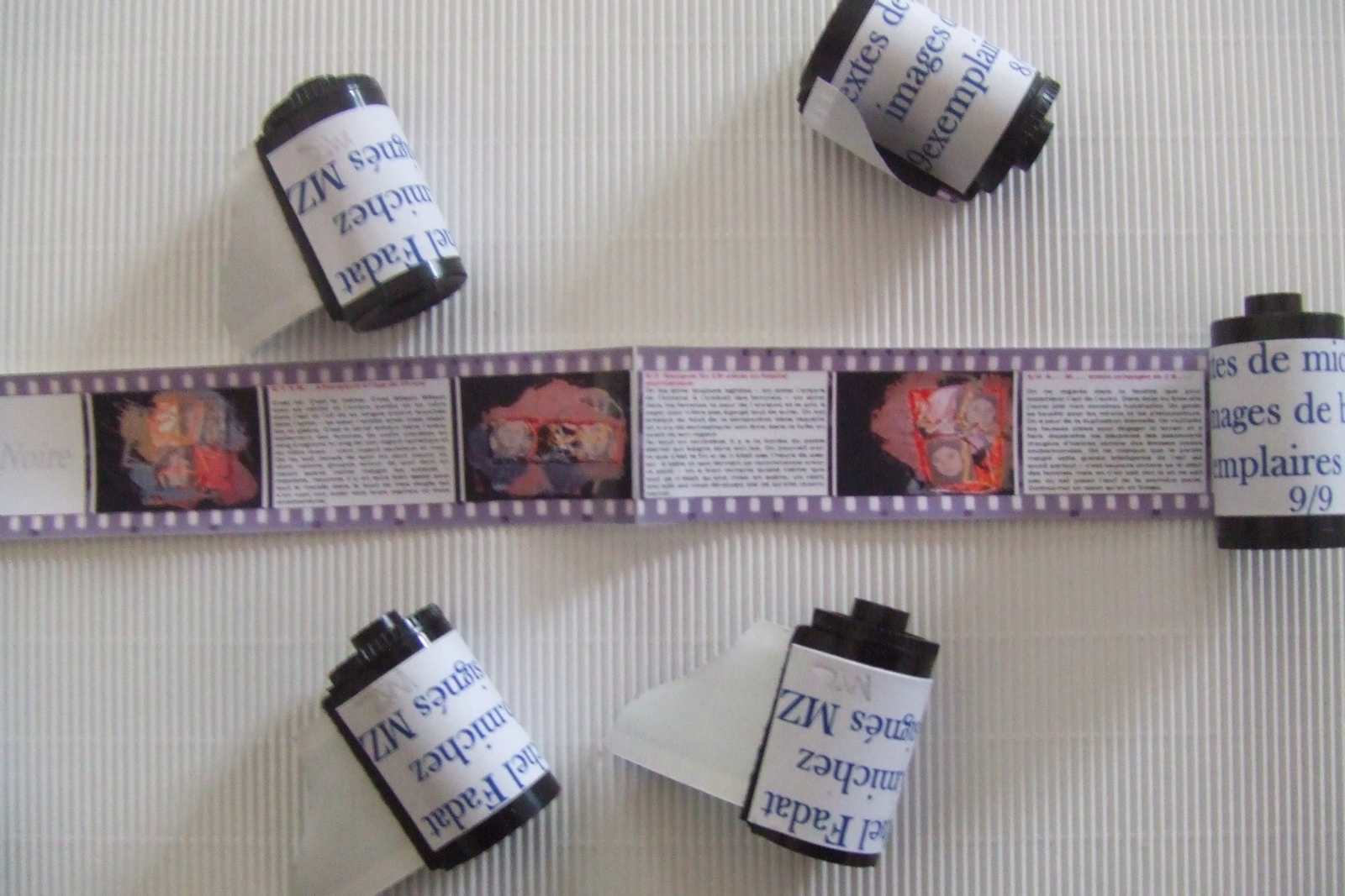 Texte et images collés sur un film de papier enroulé dans un boîtier de pellicule photographique. La lecture se fait à la loupe en tirant la pellicule. La fermeture de la série noire se fait par rebobinage du film. (2,6 cm de diamètre x 4,9 cm ) neuf exemplaires numérotés et signés, dont deux réservés aux auteurs (40 €)