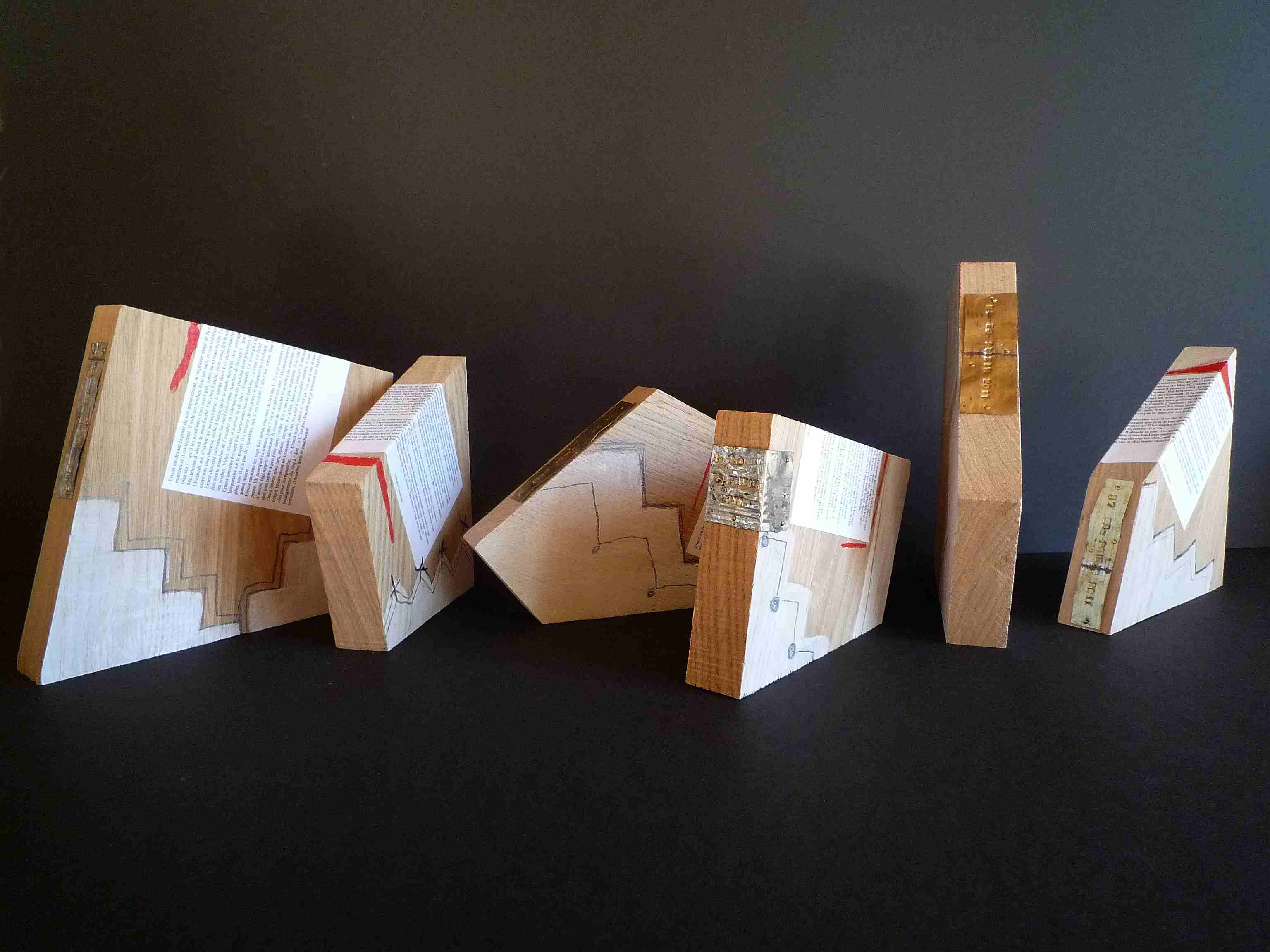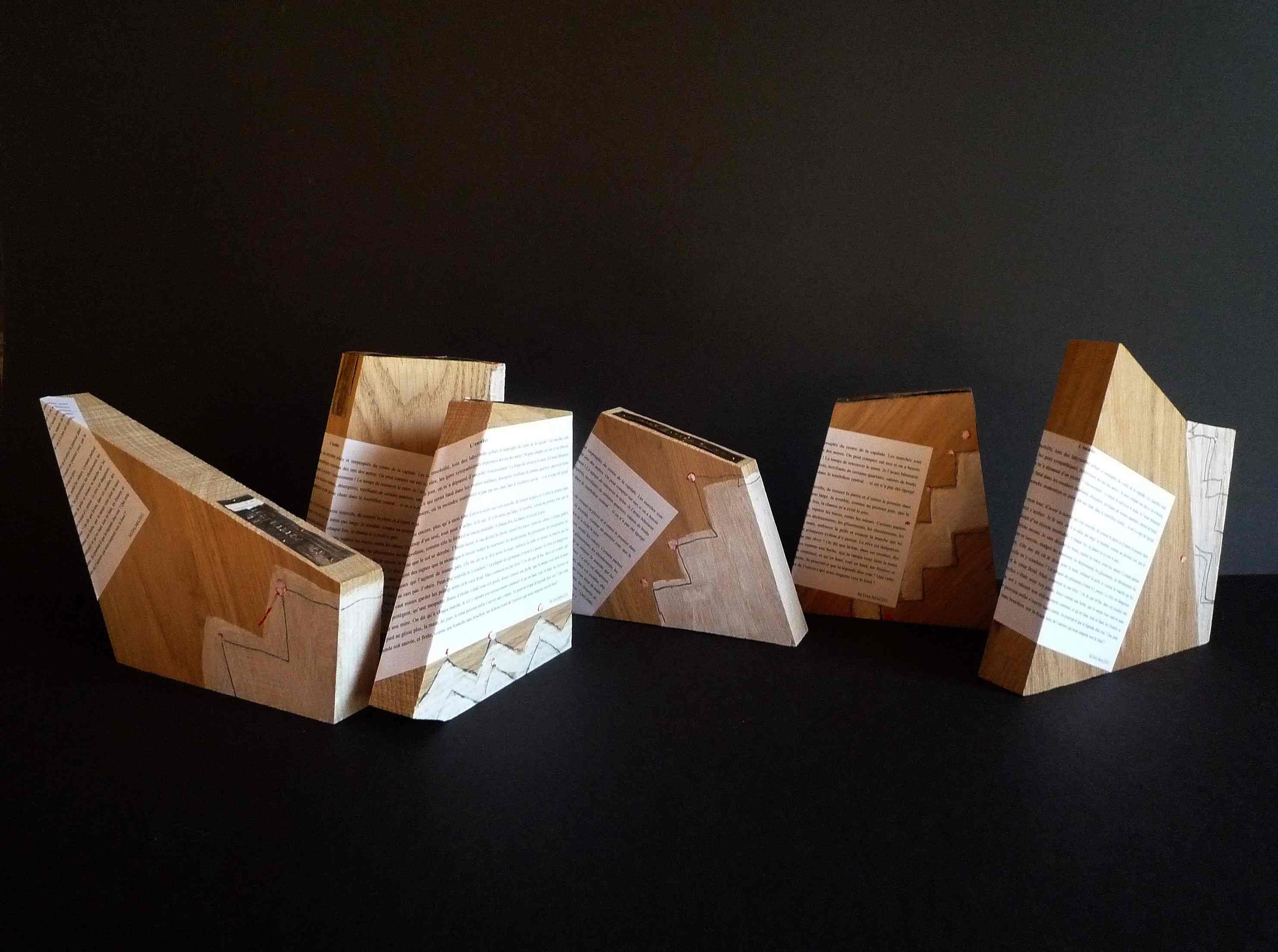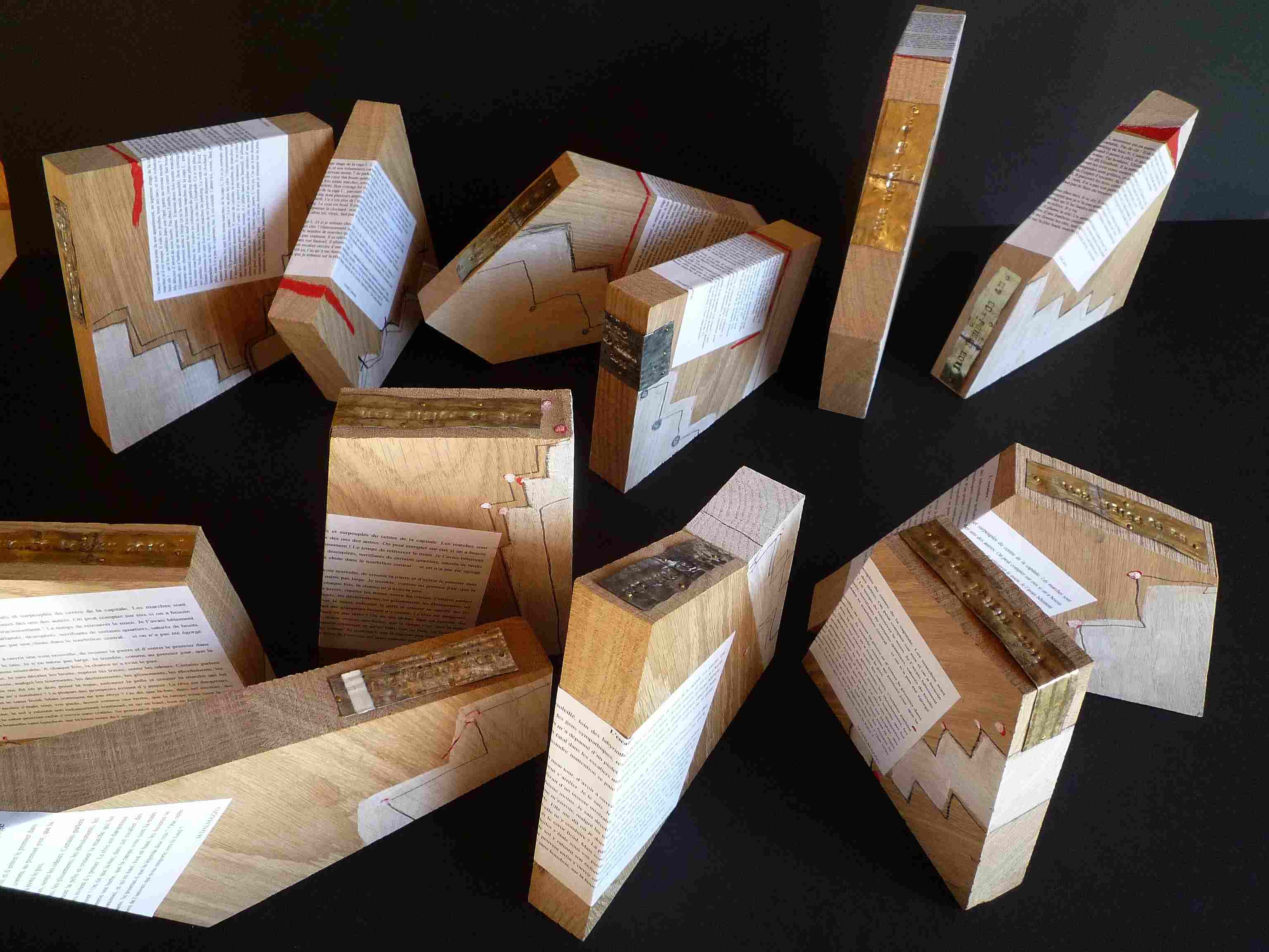 poïein volume 87 (2011) ESCALIER... Gérald Castéras, Michel Dalmazzo, Patrick Peltier. Bois de chêne (chutes de construction d'un escalier), texte collé, dessin à la peinture et au crayon, justificatif gravé sur une chute de boîte de conserve cloué sur le bois (dimensions variables). Les exemplaires 1 à 6 sont accompagnés du texte de Michel Dalmazzo et les exemplaires 7 à 12 de celui de Gérald Castéras. 12 exemplaires dont 4 réservés. (40 € )